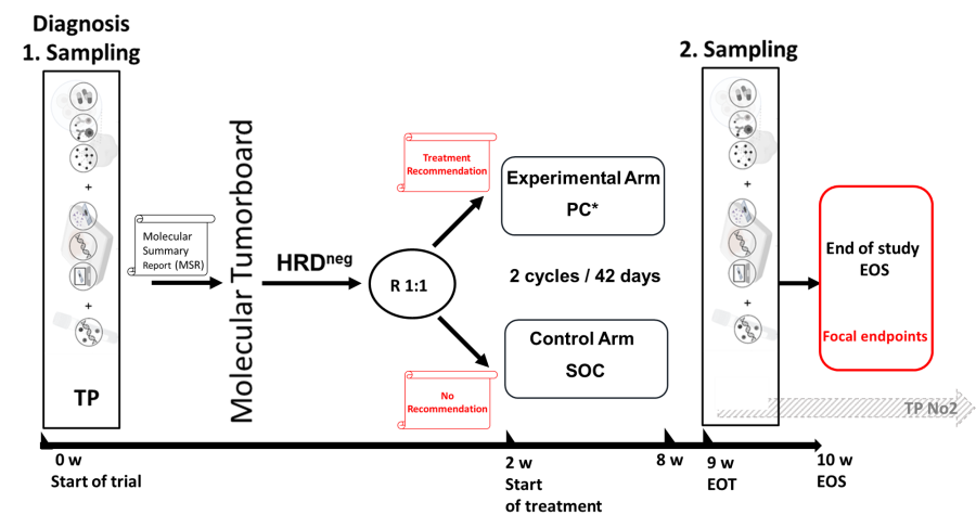 Wir werden 120 HRDneg Patienten über einen Zeitraum von zwei Jahren rekrutieren. Dazu werden wir neu diagnostizierte epitheliale OC- und Karzinosarkom-Patienten mit einem pathologisch bestätigten FIGO-Stadium IIIC und IV einschließen, die zum Zeitpunkt der Diagnose oder innerhalb der ersten 2 Wochen nach der Diagnose keine unmittelbare systemische oder chirurgische Behandlung benötigen. Die allgemeine Operabilität wird nach 2 Zyklen Chemotherapie oder 42 Behandlungstagen angestrebt. Zunächst werden alle eingeschlossenen Patienten, unabhängig vom HRD-Status, unter Verwendung von bisher unbehandeltem Tumormaterial analysiert. Die Ergebnisse aller Tumorprofil Technologien werden mit klinischen und diagnostischen Routinedaten zusammengeführt und in einem sogenannten Molecular Summary Report (MSR) zusammengefasst (1).